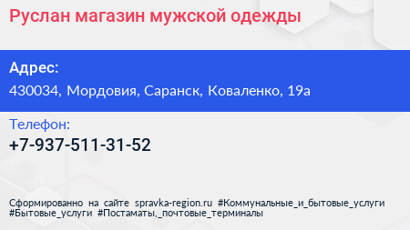 Руслан, магазин мужской одежды по адресу 430034, Мордовия, Саранск, Коваленко, 19а в дальнейшем Организация, размещена в следующих категориях: