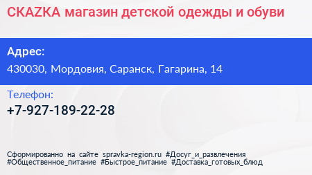 СКАZКА, магазин детской одежды и обуви по адресу 430030, Мордовия, Саранск, Гагарина, 14 в дальнейшем Организация, размещена в следующих категориях: