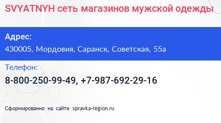 SVYATNYH, сеть магазинов мужской одежды по адресу 430005, Мордовия, Саранск, Советская, 55а в дальнейшем Организация, размещена в следующих категориях: