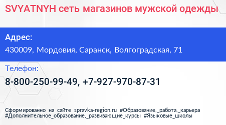 SVYATNYH, сеть магазинов мужской одежды по адресу 430009, Мордовия, Саранск, Волгоградская, 71 в дальнейшем Организация, размещена в следующих категориях:
