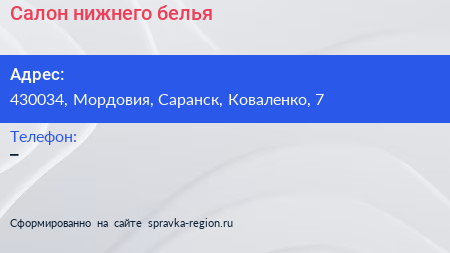 Салон нижнего белья по адресу 430034, Мордовия, Саранск, Коваленко, 7 в дальнейшем Организация, размещена в следующих категориях: