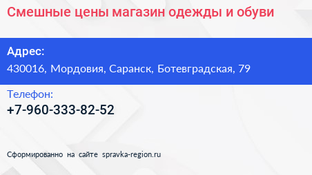 Смешные цены, магазин одежды и обуви по адресу 430016, Мордовия, Саранск, Ботевградская, 79 в дальнейшем Организация, размещена в следующих категориях: