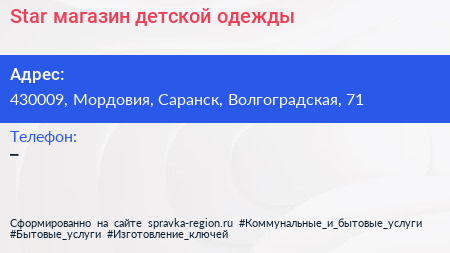 Star, магазин детской одежды по адресу 430009, Мордовия, Саранск, Волгоградская, 71 в дальнейшем Организация, размещена в следующих категориях: