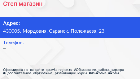 Степ, магазин по адресу 430005, Мордовия, Саранск, Полежаева, 23 в дальнейшем Организация, размещена в следующих категориях: