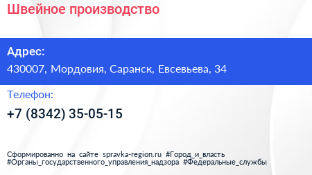 Швейное производство по адресу 430007, Мордовия, Саранск, Евсевьева, 34 в дальнейшем Организация, размещена в следующих категориях: