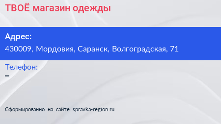 ТВОЁ, магазин одежды по адресу 430009, Мордовия, Саранск, Волгоградская, 71 в дальнейшем Организация, размещена в следующих категориях: