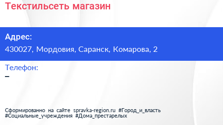 Текстильсеть, магазин по адресу 430027, Мордовия, Саранск, Комарова, 2 в дальнейшем Организация, размещена в следующих категориях: