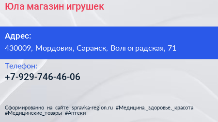 Юла, магазин игрушек по адресу 430009, Мордовия, Саранск, Волгоградская, 71 в дальнейшем Организация, размещена в следующих категориях: