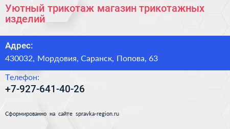 Уютный трикотаж, магазин трикотажных изделий по адресу 430032, Мордовия, Саранск, Попова, 63 в дальнейшем Организация, размещена в следующих категориях: