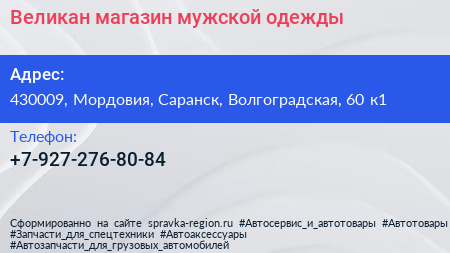 Великан, магазин мужской одежды по адресу 430009, Мордовия, Саранск, Волгоградская, 60 к1 в дальнейшем Организация, размещена в следующих категориях: