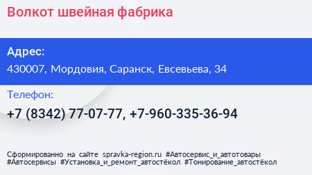 Волкот, швейная фабрика по адресу 430007, Мордовия, Саранск, Евсевьева, 34 в дальнейшем Организация, размещена в следующих категориях: