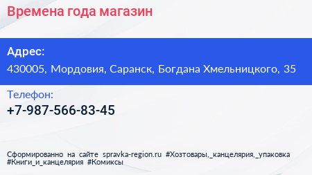 Времена года, магазин по адресу 430005, Мордовия, Саранск, Богдана Хмельницкого, 35 в дальнейшем Организация, размещена в следующих категориях:
