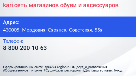 kari, сеть магазинов обуви и аксессуаров по адресу 430005, Мордовия, Саранск, Советская, 55а в дальнейшем Организация, размещена в следующих категориях: