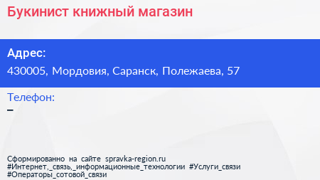 Букинист, книжный магазин по адресу 430005, Мордовия, Саранск, Полежаева, 57 в дальнейшем Организация, размещена в следующих категориях: