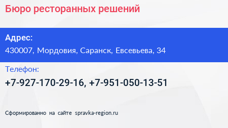 Бюро ресторанных решений по адресу 430007, Мордовия, Саранск, Евсевьева, 34 в дальнейшем Организация, размещена в следующих категориях: