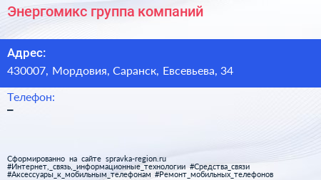 Энергомикс, группа компаний по адресу 430007, Мордовия, Саранск, Евсевьева, 34 в дальнейшем Организация, размещена в следующих категориях: