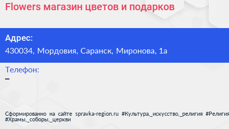 Flowers, магазин цветов и подарков по адресу 430034, Мордовия, Саранск, Миронова, 1а в дальнейшем Организация, размещена в следующих категориях: