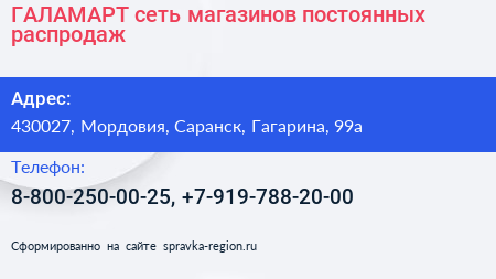 ГАЛАМАРТ, сеть магазинов постоянных распродаж по адресу 430027, Мордовия, Саранск, Гагарина, 99а в дальнейшем Организация, размещена в следующих категориях: