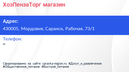 ХозПензаТорг, магазин по адресу 430005, Мордовия, Саранск, Рабочая, 73/1 в дальнейшем Организация, размещена в следующих категориях: