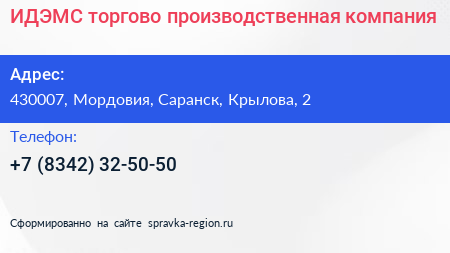 ИДЭМС, торгово-производственная компания по адресу 430007, Мордовия, Саранск, Крылова, 2 в дальнейшем Организация, размещена в следующих категориях:
