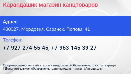 Карандашик, магазин канцтоваров по адресу 430027, Мордовия, Саранск, Попова, 41 в дальнейшем Организация, размещена в следующих категориях: