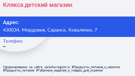 Клякса, детский магазин по адресу 430034, Мордовия, Саранск, Коваленко, 7 в дальнейшем Организация, размещена в следующих категориях:
