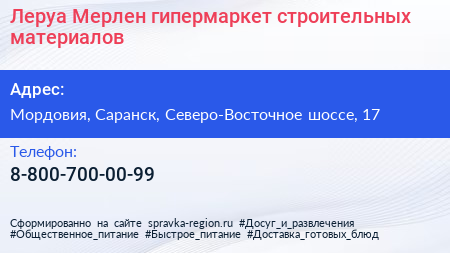 Леруа Мерлен, гипермаркет строительных материалов по адресу Мордовия, Саранск, Северо-Восточное шоссе, 17 в дальнейшем Организация, размещена в следующих категориях: