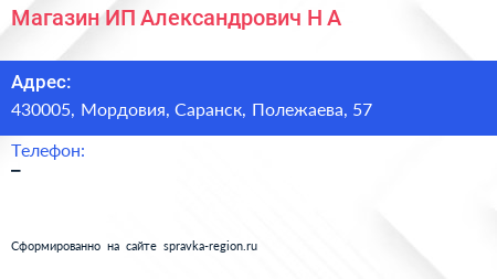 Магазин, ИП Александрович Н.А. по адресу 430005, Мордовия, Саранск, Полежаева, 57 в дальнейшем Организация, размещена в следующих категориях: