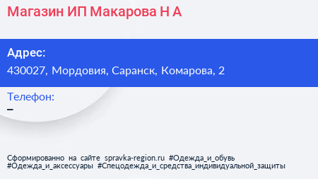 Магазин, ИП Макарова Н.А. по адресу 430027, Мордовия, Саранск, Комарова, 2 в дальнейшем Организация, размещена в следующих категориях: