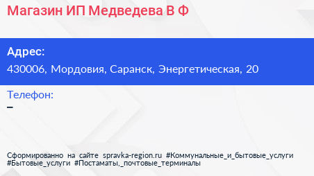 Магазин, ИП Медведева В.Ф. по адресу 430006, Мордовия, Саранск, Энергетическая, 20 в дальнейшем Организация, размещена в следующих категориях: