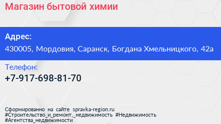 Магазин бытовой химии по адресу 430005, Мордовия, Саранск, Богдана Хмельницкого, 42а в дальнейшем Организация, размещена в следующих категориях: