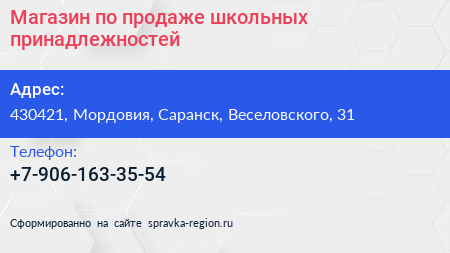 Магазин по продаже школьных принадлежностей по адресу 430421, Мордовия, Саранск, Веселовского, 31 в дальнейшем Организация, размещена в следующих категориях: