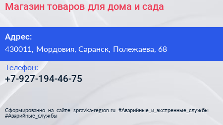 Магазин товаров для дома и сада по адресу 430011, Мордовия, Саранск, Полежаева, 68 в дальнейшем Организация, размещена в следующих категориях: