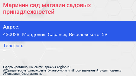 Маринин сад, магазин садовых принадлежностей по адресу 430028, Мордовия, Саранск, Веселовского, 59 в дальнейшем Организация, размещена в следующих категориях: