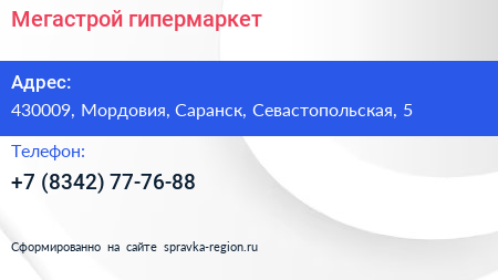 Мегастрой, гипермаркет по адресу 430009, Мордовия, Саранск, Севастопольская, 5 в дальнейшем Организация, размещена в следующих категориях: