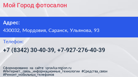Мой Город, фотосалон по адресу 430032, Мордовия, Саранск, Ульянова, 93 в дальнейшем Организация, размещена в следующих категориях: