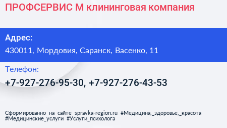 ПРОФСЕРВИС М, клининговая компания по адресу 430011, Мордовия, Саранск, Васенко, 11 в дальнейшем Организация, размещена в следующих категориях: