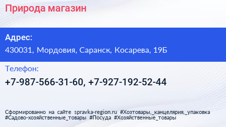 Природа, магазин по адресу 430031, Мордовия, Саранск, Косарева, 19Б в дальнейшем Организация, размещена в следующих категориях: