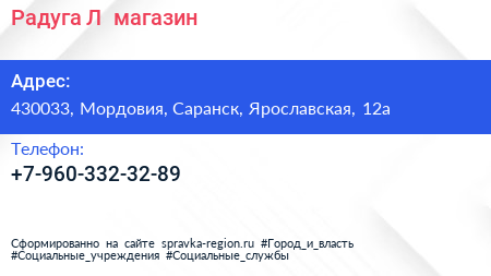 Радуга Л+, магазин по адресу 430033, Мордовия, Саранск, Ярославская, 12а в дальнейшем Организация, размещена в следующих категориях: