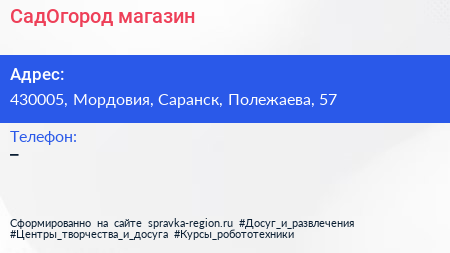 СадОгород, магазин по адресу 430005, Мордовия, Саранск, Полежаева, 57 в дальнейшем Организация, размещена в следующих категориях: