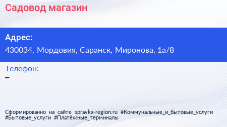 Садовод, магазин по адресу 430034, Мордовия, Саранск, Миронова, 1а/8 в дальнейшем Организация, размещена в следующих категориях:
