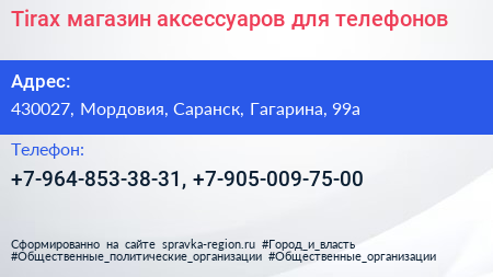 Tirax, магазин аксессуаров для телефонов по адресу 430027, Мордовия, Саранск, Гагарина, 99а в дальнейшем Организация, размещена в следующих категориях: