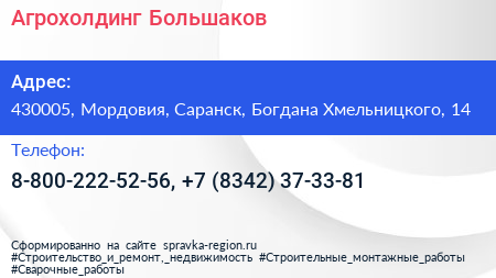 Агрохолдинг Большаков по адресу 430005, Мордовия, Саранск, Богдана Хмельницкого, 14 в дальнейшем Организация, размещена в следующих категориях: