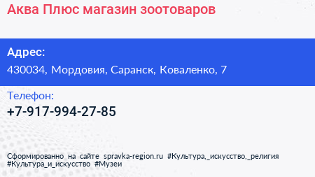 Аква Плюс, магазин зоотоваров по адресу 430034, Мордовия, Саранск, Коваленко, 7 в дальнейшем Организация, размещена в следующих категориях: