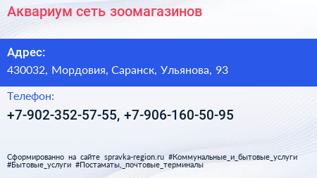 Аквариум, сеть зоомагазинов по адресу 430032, Мордовия, Саранск, Ульянова, 93 в дальнейшем Организация, размещена в следующих категориях:
