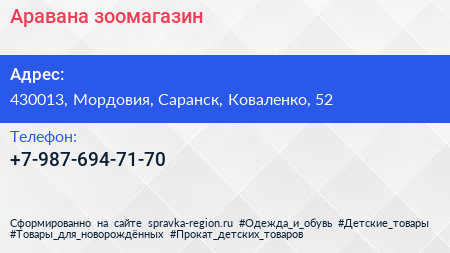 Аравана, зоомагазин по адресу 430013, Мордовия, Саранск, Коваленко, 52 в дальнейшем Организация, размещена в следующих категориях: