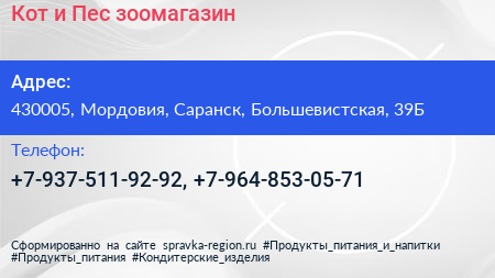 Кот и Пес, зоомагазин по адресу 430005, Мордовия, Саранск, Большевистская, 39Б в дальнейшем Организация, размещена в следующих категориях: