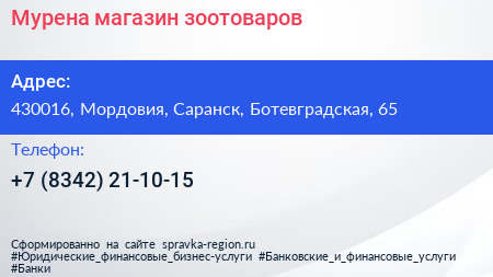 Мурена, магазин зоотоваров по адресу 430016, Мордовия, Саранск, Ботевградская, 65 в дальнейшем Организация, размещена в следующих категориях: