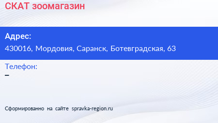СКАТ, зоомагазин по адресу 430016, Мордовия, Саранск, Ботевградская, 63 в дальнейшем Организация, размещена в следующих категориях: