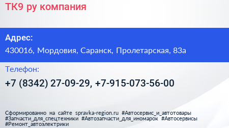 ТК9.ру, компания по адресу 430016, Мордовия, Саранск, Пролетарская, 83а в дальнейшем Организация, размещена в следующих категориях: